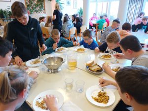 Sedmošolci smo že veselo zakorakali k aktivnostim naproti. Čez dan smo uživali v prelepih razgledih kraja Gorenja, bili aktivni na pohodu, izvedeli nekaj novega o Kunigundi, se večkrat dobro najedli. Zvečer pa smo se preizkusili še v cirkuških vragolijah in uživali ob družabnih igrah. Po pestri večerni toaletni ceremoniji smo končno popadali v postelje in z lepimi željami pričakujemo jutrišnji dan.