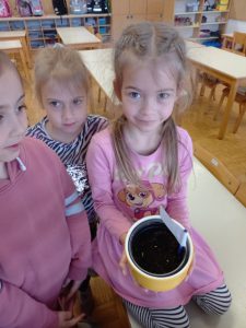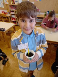 Tudi naša skrb za semena od doma se je obrestovala, saj so lončki ozeleneli – nekateri prej, drugi kasneje. Koliko veselja je bilo! Pred počitnicami smo sadike solate, kumar, sončnic, črne kumine, žametovk, fižola in drugih vrtnin odnesli domov, kjer jim bomo našli primerno mesto za nadaljnjo rast.