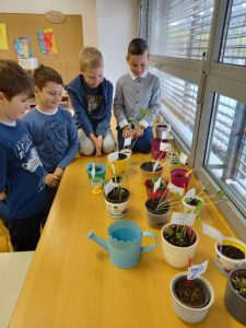 V aprilu so učenci 1.c naredili prve vrtnarske korake v šoli. Posejali so semena rastlin, ki so jih prinesli od doma, naredili pa smo tudi poskus. Lonček s semeni smo dali v omaro, a je vseeno skalil, le drugačne barve so bili poganjki. Rastlina, ki ni imela vode, ni skalila. Ker smo prijazni, smo po končanem poskusu vse tri lončke rastlin rastline razvajali s svetlobo in vodo in ugotovili smo, da so rastline kmalu nadoknadile primanjkljaj. To nam je bilo zelo všeč.