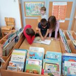 Z učenci 2. b-razreda enkrat tedensko obiščemo knjižnico, kjer si izposodimo zanimive knjige. Knjižničarka nam večkrat prebere kakšno pravljico. Pripravila pa nam je tudi bralni nahrbtnik. To je nahrbtnik, ki vsebuje zvezek, 4 knjige in revijo ter knjigo, ki je namenjena odraslim, našim staršem. Bralni nahrbtnik odnese učenec domov in ga ima doma en teden. V tem času bere knjige iz nahrbtnika ter o njih nekaj nariše in napiše. S tem krepijo svoje bralne izkušnje, širijo besedni zaklad ter postajajo samostojnejši in samozavestnejši bralci.
