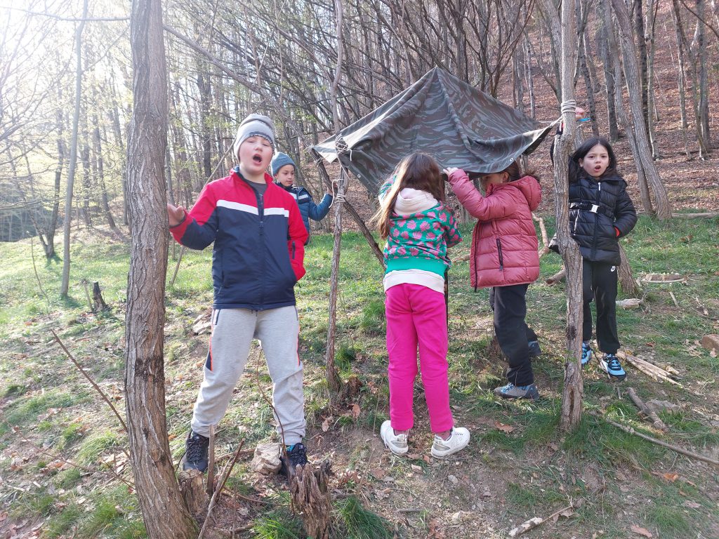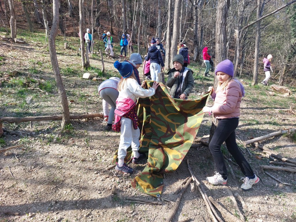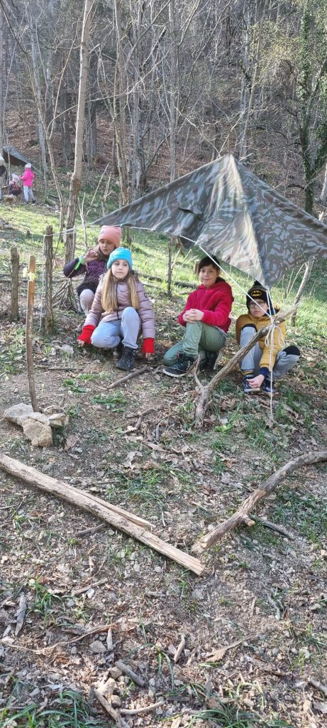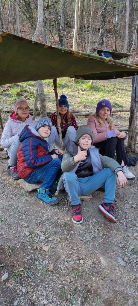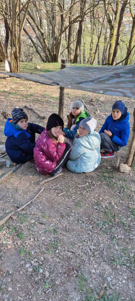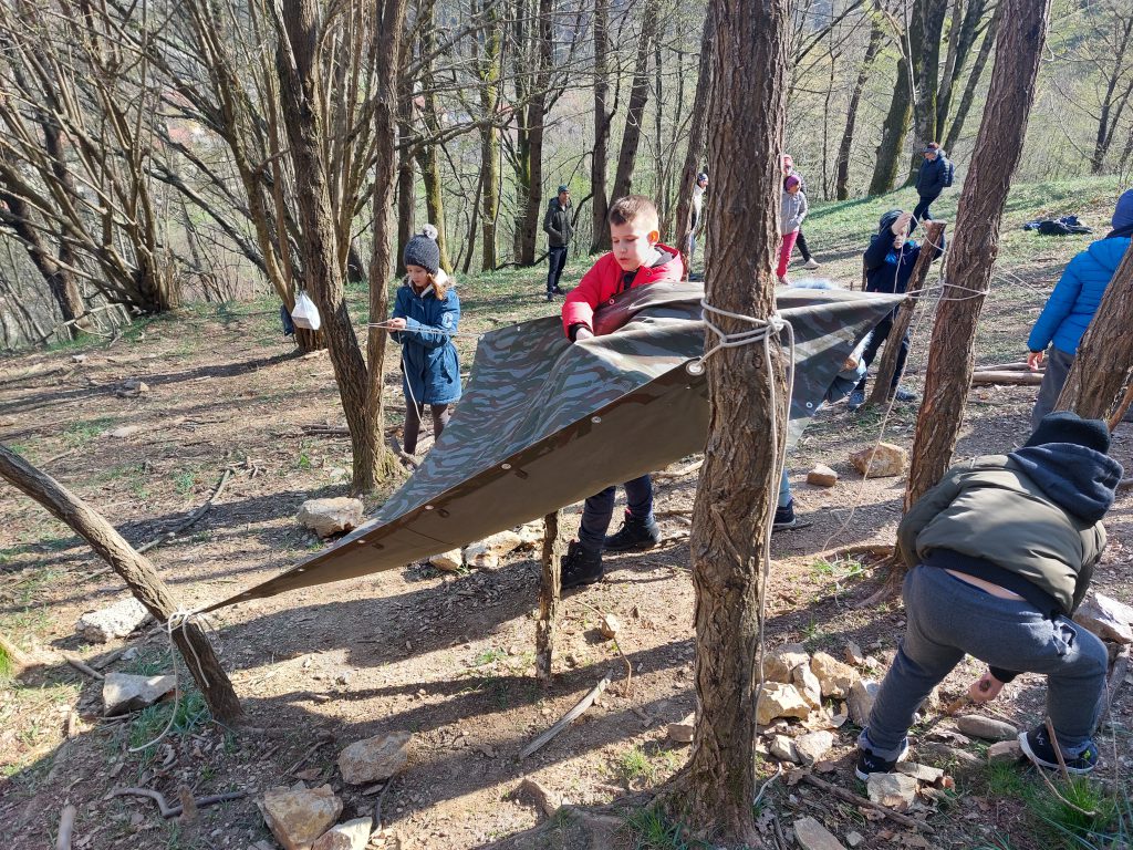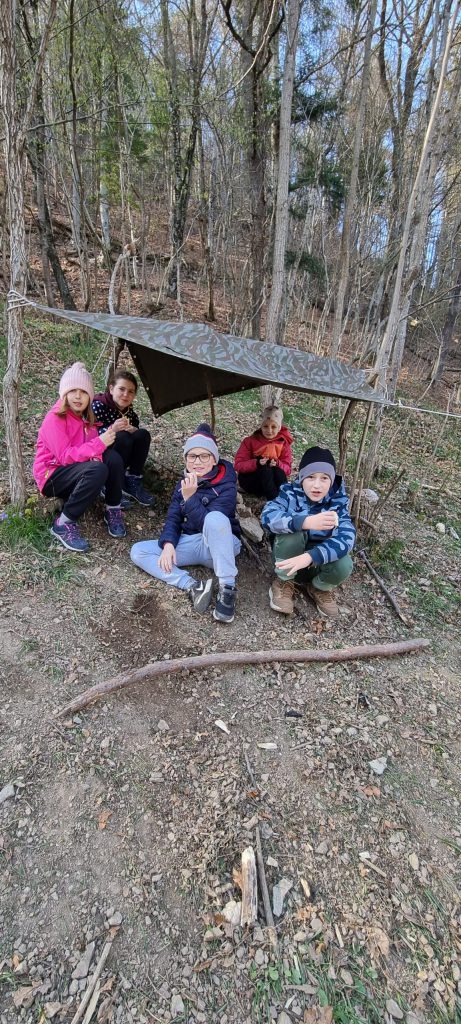 Za nami je že tretji dan šole v naravi. Vreme je kot naročeno za dejavnosti na prostem. Po dopoldanskem plavanju smo se popoldne povzpeli do gozdička, kjer smo postavljali bivake. Uporabili smo tudi naravni material, ki smo ga našli v bližini. Vse skupine smo bile s svojimi idejami izvirne in ustvarjalne. Po vrnitvi v dom smo si vzeli čas za družabne igre, po večerji smo smuknili v pižame, si umili zobe in z navdušenjem odšli v kamro na filmski večer. Utrujeni po vseh dejavnostih smo odšli v svoje sobe in hitro zaspali.