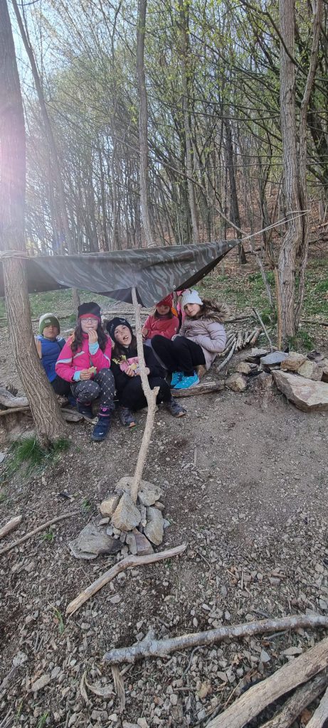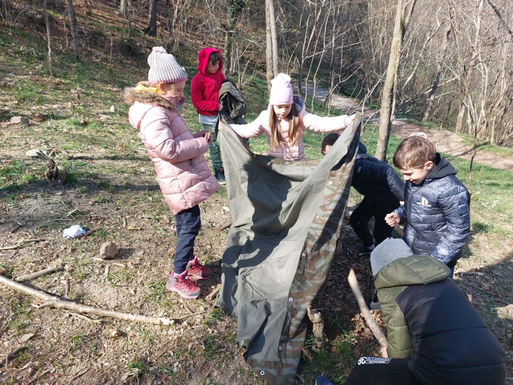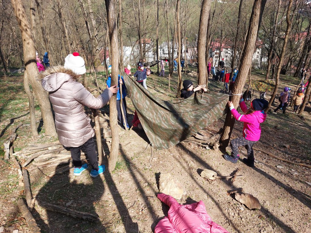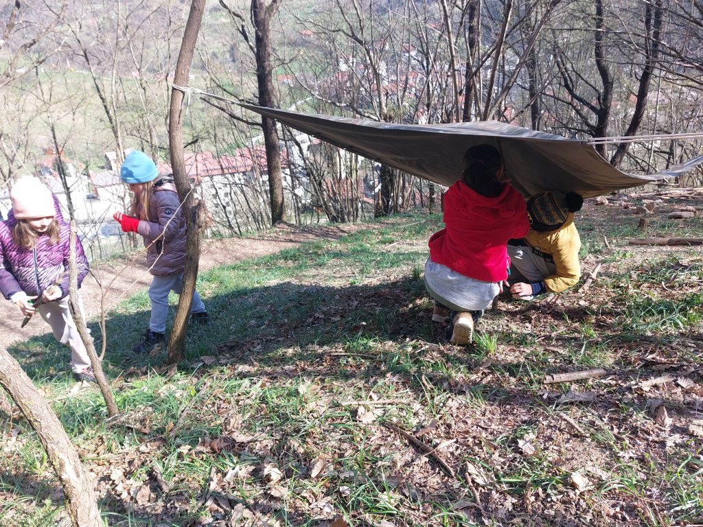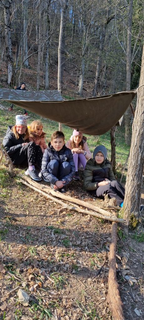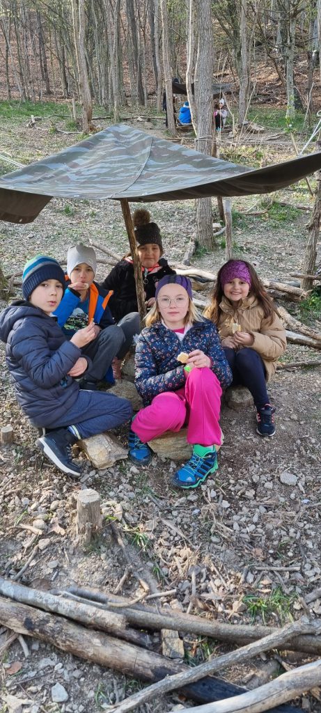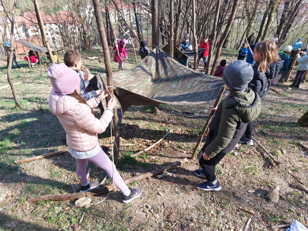 Za nami je že tretji dan šole v naravi. Vreme je kot naročeno za dejavnosti na prostem. Po dopoldanskem plavanju smo se popoldne povzpeli do gozdička, kjer smo postavljali bivake. Uporabili smo tudi naravni material, ki smo ga našli v bližini. Vse skupine smo bile s svojimi idejami izvirne in ustvarjalne. Po vrnitvi v dom smo si vzeli čas za družabne igre, po večerji smo smuknili v pižame, si umili zobe in z navdušenjem odšli v kamro na filmski večer. Utrujeni po vseh dejavnostih smo odšli v svoje sobe in hitro zaspali.