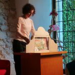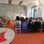 Tam nam je knjižničarka razkazala knjižnico, tako, da nas je popeljala v vse prostore knjižnice. Povedala nam je, koliko knjig imajo v knjižnici, kje lahko poiščemo kakšno knjigo, ki si jo želimo prebrati ter kakšne knjige vse si lahko izposodimo v njihovi knjižnici. V pravljični sobi nam je s pomočjo kamišibaja pripovedovala pravljico avtorja R. Bonilla z naslovom Najvišja gora knjig na svetu. Ob pravljici smo spoznali, da nas lahko le-te ponesejo v svet domišljije. Ob koncu obiska smo dobili tudi izkaznice, da bomo lahko s starši odhajali v knjižnico in brali knjige.