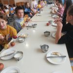 ŽIVILA NA TRADICIONALNEM SLOVENSKEM ZAJTRKU so bila nehomogenizirano mleko Mlekarne Celeia, eko cvetlični med Čebelarstva Vajda, bio maslo Mlekarne Krepko, domači kruh, črni hlebec in beli kruh v modelu Pekarne Blatnik in jabolko s kmetije Karlovček. Učenci so z veseljem pojedli samopostrežni zajtrk in uživali pri čajanki.