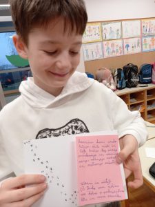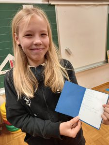 Nasmejani prostovoljci vsak dan natančno zapisujejo voščila, jih skrbno lepijo v voščilnice in pripravljajo za prevzem. Prepričani smo, da bomo lepo razveselili starostnike iz naše soseske.