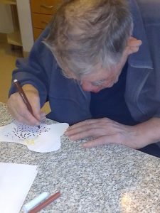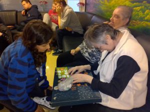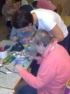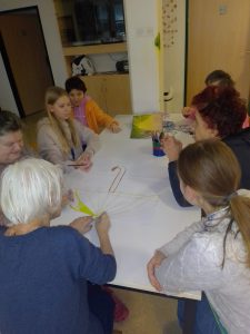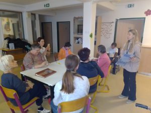 Skupina prostovoljk je obiskala uporabnike VDC Novo mesto, enota Šmihel. Razdeljene v majhne skupine so prisluhnili različnim pravljicam. Po poslušanju so učenci pripravili različne delavnice. Ena skupina je barvala pustne maske, v drugi skupini pa so se pogovarjali o vremenu (barvali so dežnik in balon, risali mavrico). Zaja pa je po prebrani pravljici Krtkov mirni kotiček pripravila poseben mirni ‘kotiček’ v veliki škatli za čevlje. V njo je shranila različne stvari. Uporabniki so tako spoznali/občutili ptičje perje, koruzna zrna, školjke, vodo …; na škatli so prepoznavali oblike in lepili svoje 3D nalepke.