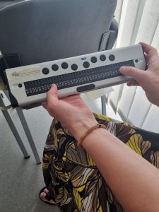 V drugem delu smo si ogledali specialno Knjižnico slepih in slabovidnih Minke Skaberne. Gaja Bec iz Zveze slepih in slabovidnih nam je predstavila delovanje in zgodovino knjižnice, pripomočke, s katerimi si pomagajo slabovidni, zakonitosti brajeve pisave in načine zapisovanja te vrste abecede. Videli smo tudi njihove prostore, knjižnično zbirko, snemalni studio, se seznanili z načini včlanjevanja v knjižnico. Ob koncu smo si ogledali zbirko fotografij, ki je prilagojena za slepe in slabovidne. Člani Zveze slepih in slabovidnih se trudijo s predstavitvijo svojega dela in opozarjajo na svoje pravice o dostopnosti do (vseh) ustanov. Tudi v šolah se knjižničarji srečujemo z različnimi uporabniki, ki potrebujejo prilagoditve pri branju. Več informacij bomo zagotovo dobili v tej specialni knjižnici.