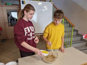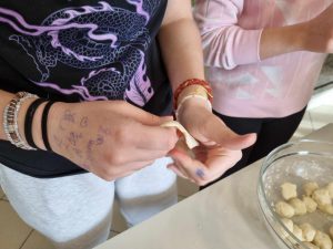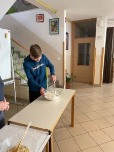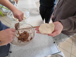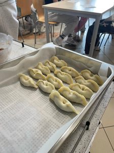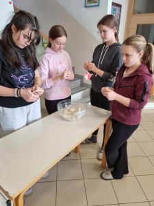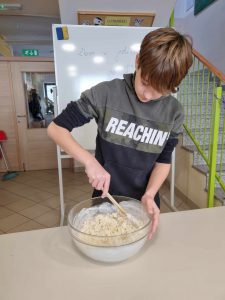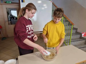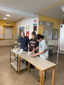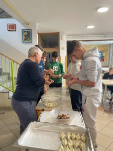 Za večerjo smo pripravili prav poseben posladek – kobariške štruklje po tradicionalnem receptu. Iz moke in vrele vode zgnetemo testo, oblikujemo osnovo in jo napolnimo z orehovim nadevom. Štruklje skuhamo v kropu, jih postrežemo z maslom in drobtinicami ter cimetovim sladkorjem. Izvrstni so.