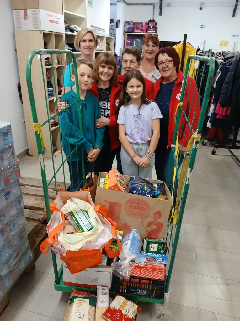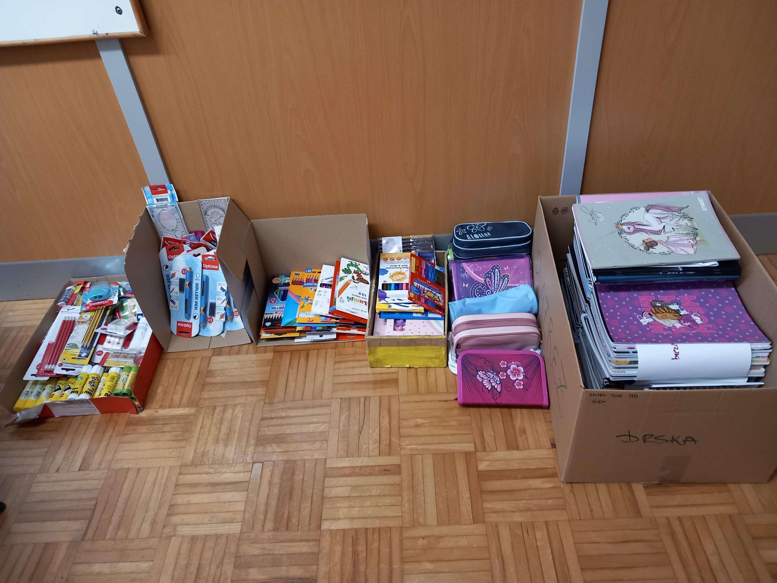 Učenci so v ponedeljek in torek v šolo prinesli nepokvarljivo hrano ali hrano z dolgim rokom trajanja, higienske pripomočke, zvezke in šolske potrebščine. Hrano in higienske pripomočke smo v torek, 13. maja že odpeljali v skladišče Humanitarnega centra na Drski, kjer smo jih predali prostovoljcem; zvezke za Karitas bomo oddali v začetku prihodnjega tedna; zvezki in šolske potrebščine za naše učence so pripravljeni.