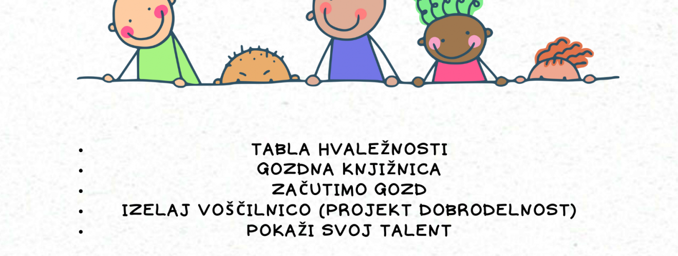 V podaljšanem bivanju bomo tako cel teden med 13. 45 in 14. 30 izvajali dejavnosti na temo hvaležnosti, bontona, pa še česa. Ker se bodo dejavnosti izvajale na različnih lokacijah, vas prosimo, DA V TEM ČASU NE PRIHAJATE PO OTROKE.