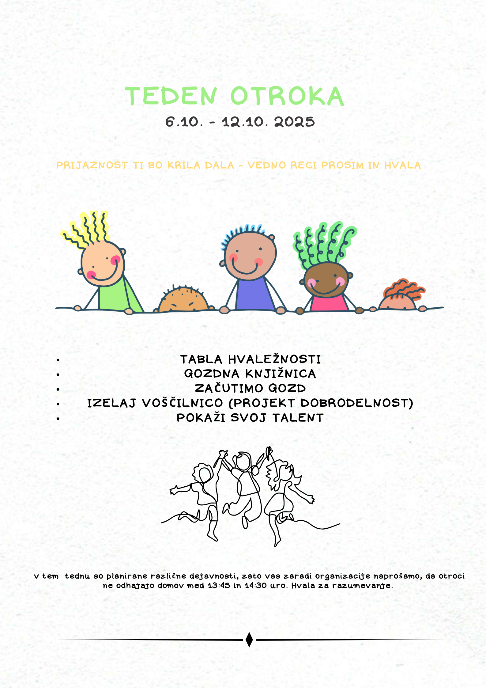V tednu med 6. in 12. 10. 2025 bo potekal že tradicionalni TEDEN OTROKA.