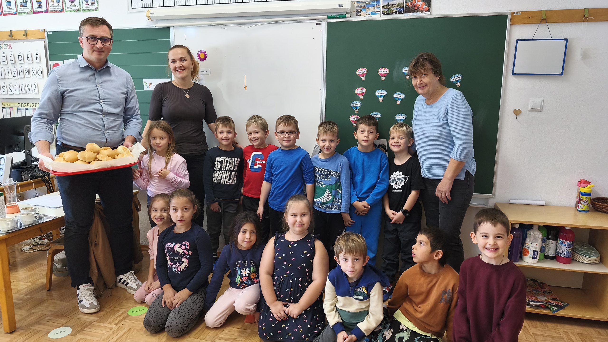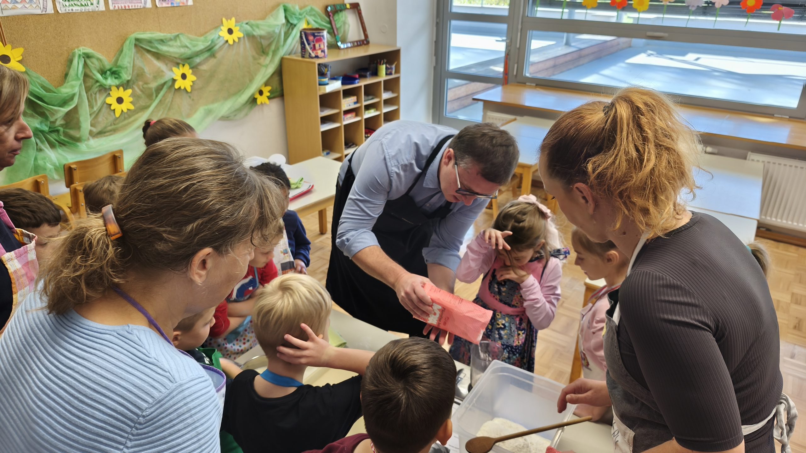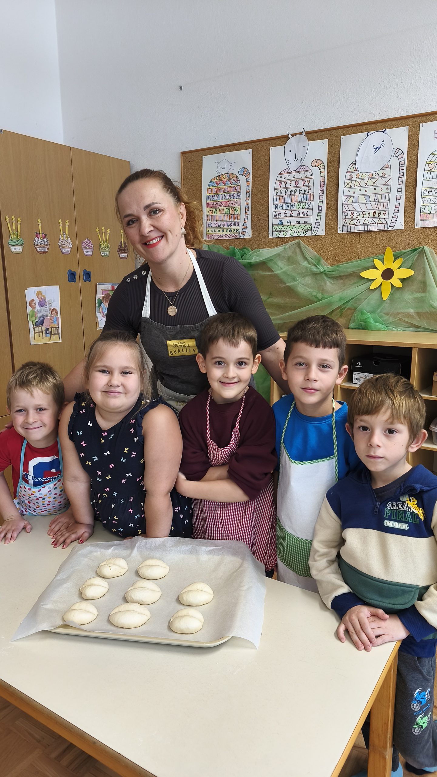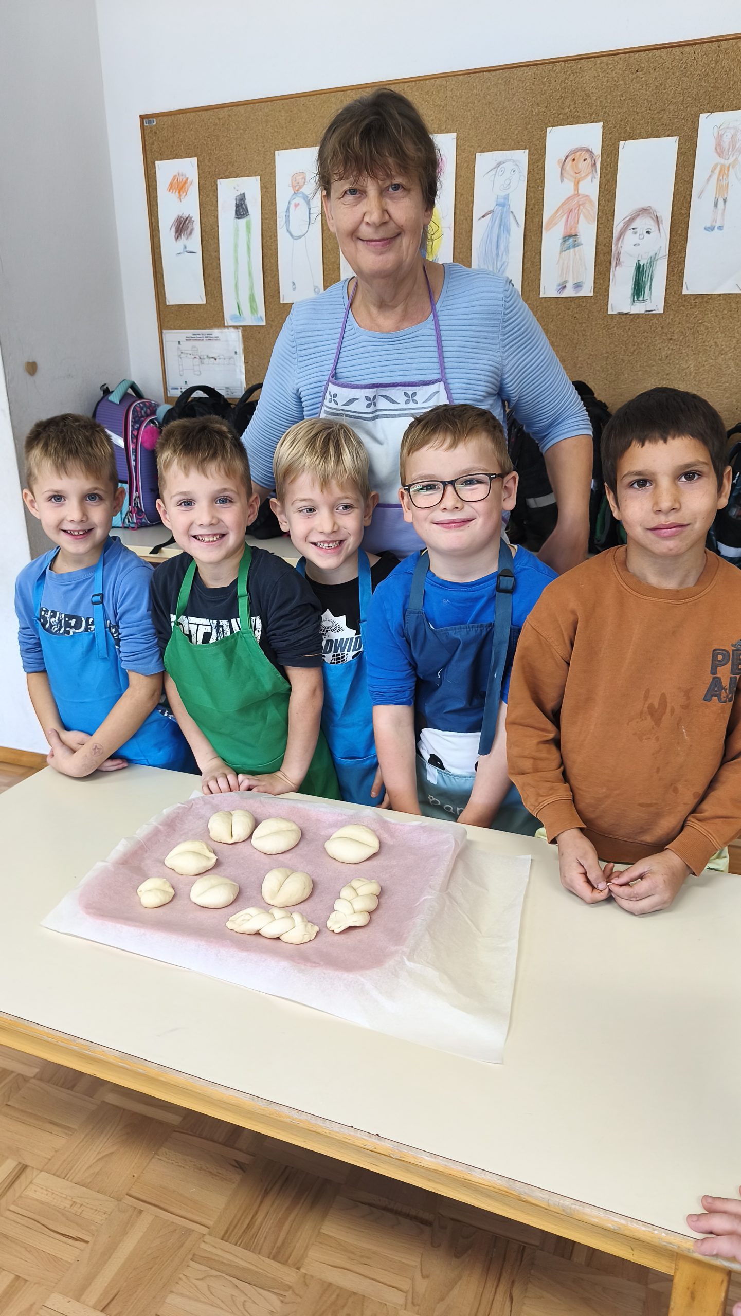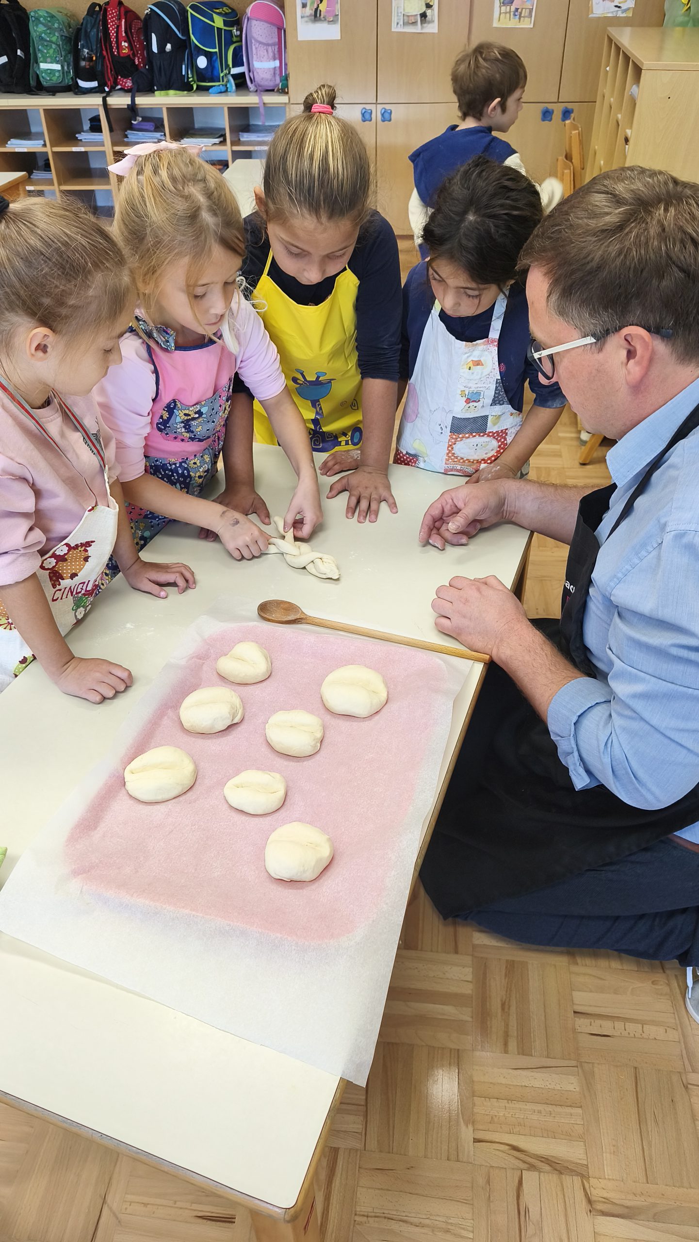 Testo so jim pomagali zgnesti Martinova mama ga. Martina, Petrova babica ga. Marija in Kajin oči g. Andrej, ki so se prijazno odzvali našemu povabilu k sodelovanju. Vsak odrasli pomočnik je svoji skupini učencev pomagal izoblikovati žemljice in pletenke, ki so jih spekli v šolski kuhinji.