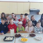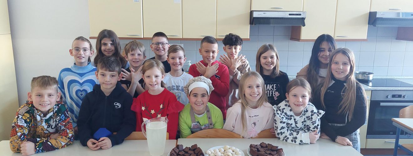 Prvo uro smo pisali test, po malici pa smo pouk nadaljevali v gospodinjski učilnici. Pripravili smo vse pripomočke in sestavine ter se razdelili v tri skupine. Prva in tretja skupina sta pekli piškote, druga pa brownije. Odlično nam je šlo od rok. Spet smo dokazali, da je v slogi moč. Poleg šolskega dela pa skupaj radi tudi zapojemo in zaplešemo ali pa se igramo stare igre na prostem.