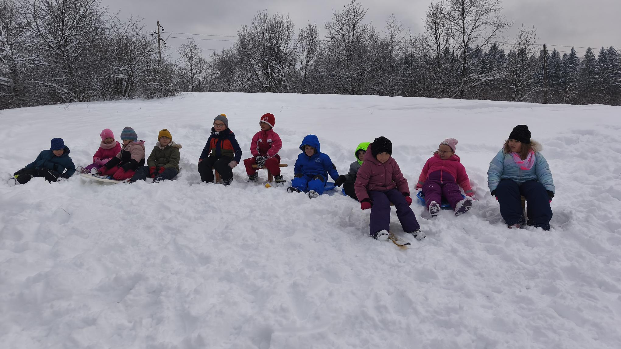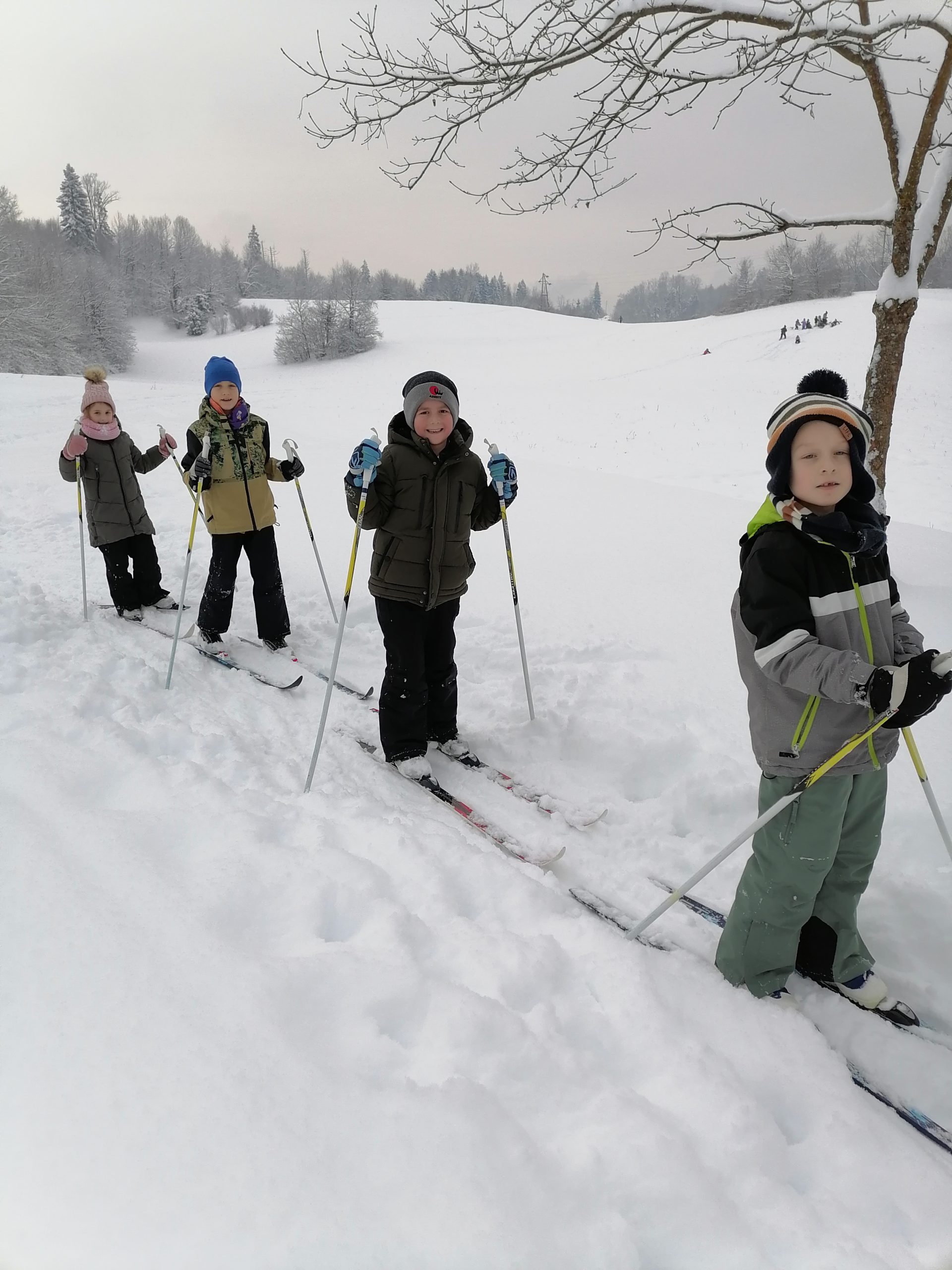 Večina otrok se je prvič preizkusila v teku na smučeh. Šlo jim je zelo dobro, razen nekaj mehkih in zabavnih padcev v sneg. Vsak krog je bilo bolje. Na bližnjem hribčku so se tudi sankali.