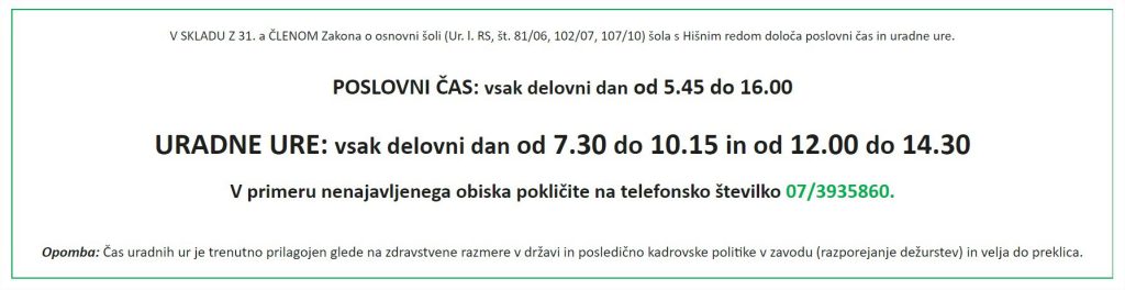 V času poslovanja šole, med 6. in 16. uro, smejo šolski prostor uporabljati le učenci, delavci šole in drugi, ki so neposredno povezani z delom šole, kot to določa urnik oddelkov oziroma prostorov. Zadrževanje učencev, ki nimajo šolskih obveznosti, na šolskem prostoru v tem času ni dovoljeno, razen v dogovoru z učitelji.